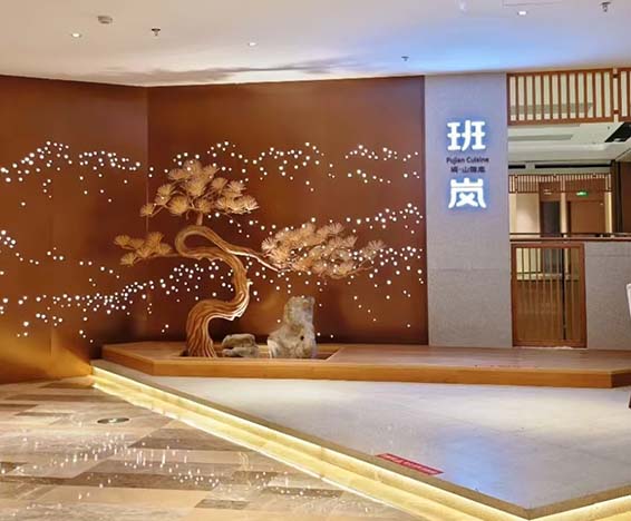 2021年,星林会·班岚落脚苏州,以高端的品质和服务,将闽地的山海味道传递到这片悠悠水乡,受到了苏州广大闽味爱好者的青睐。为让更多人品尝到地道的福建风味,班岚拓店苏州湾,在这个面向长三角、乃至全国的高端休闲度假目的地的太湖新城区域,迸发闽菜新灵感,以情怀、信念和态度传递闽味美好。食在斑岚,以建筑对话自然--木、石、水的天然结构,将闽地风光旖旎写入室内,凝缩成山与海的磅礴与静默。隐式光带嵌入墙中,勾勒出灵动轮廓。自然植物点缀,温润质感与意境中气韵流动。基因使然的沉静气质,谱写出天然能量场,与一席山海激荡交融。